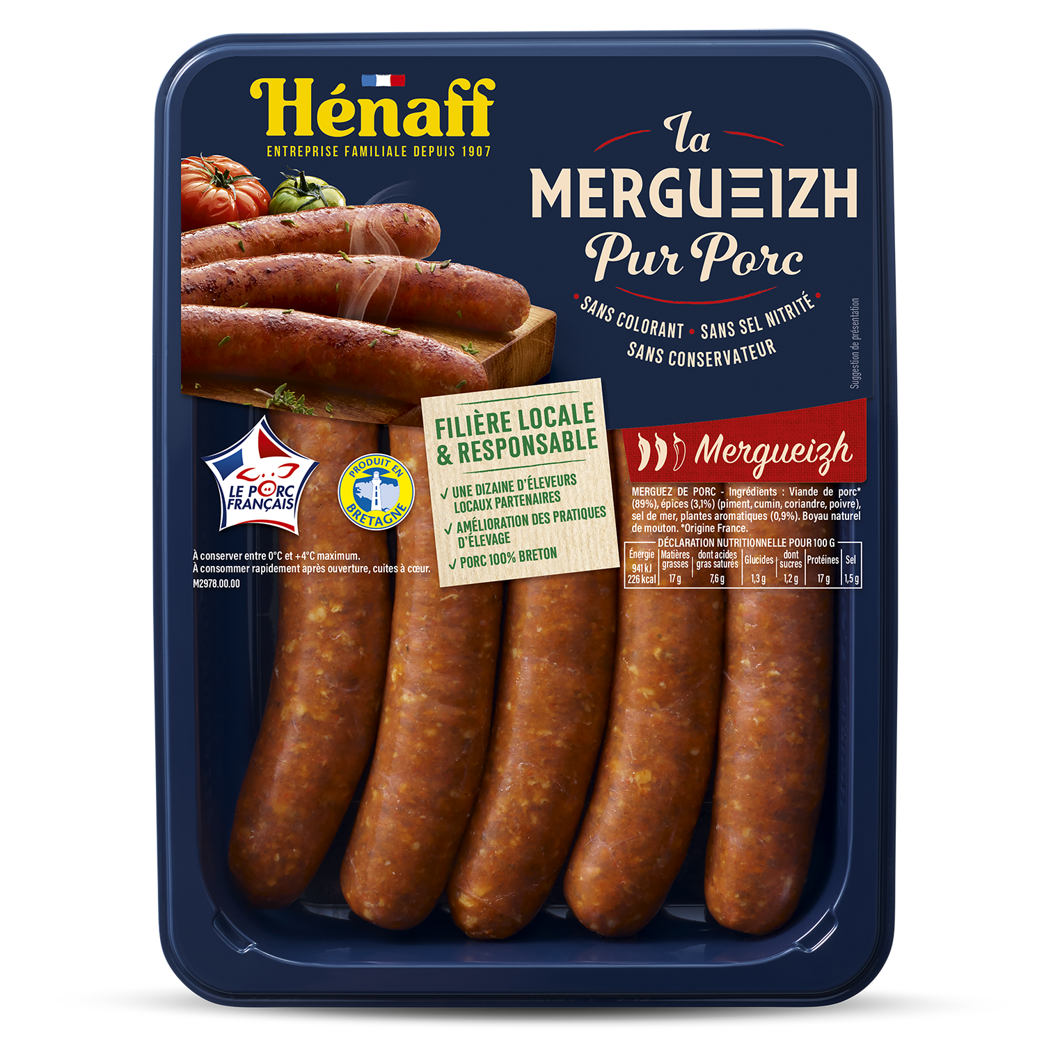 Découvrez la merguez revisitée par Hénaff. Régalez-vous avec cette merguez Pur Porc au bon goût de viande rôtie, relevée par un harmonieux et intense mélange d’épices pures. Du cumin, de la coriandre, du piment et du poivre biologique pour sublimer la fameuse recette Hénaff.